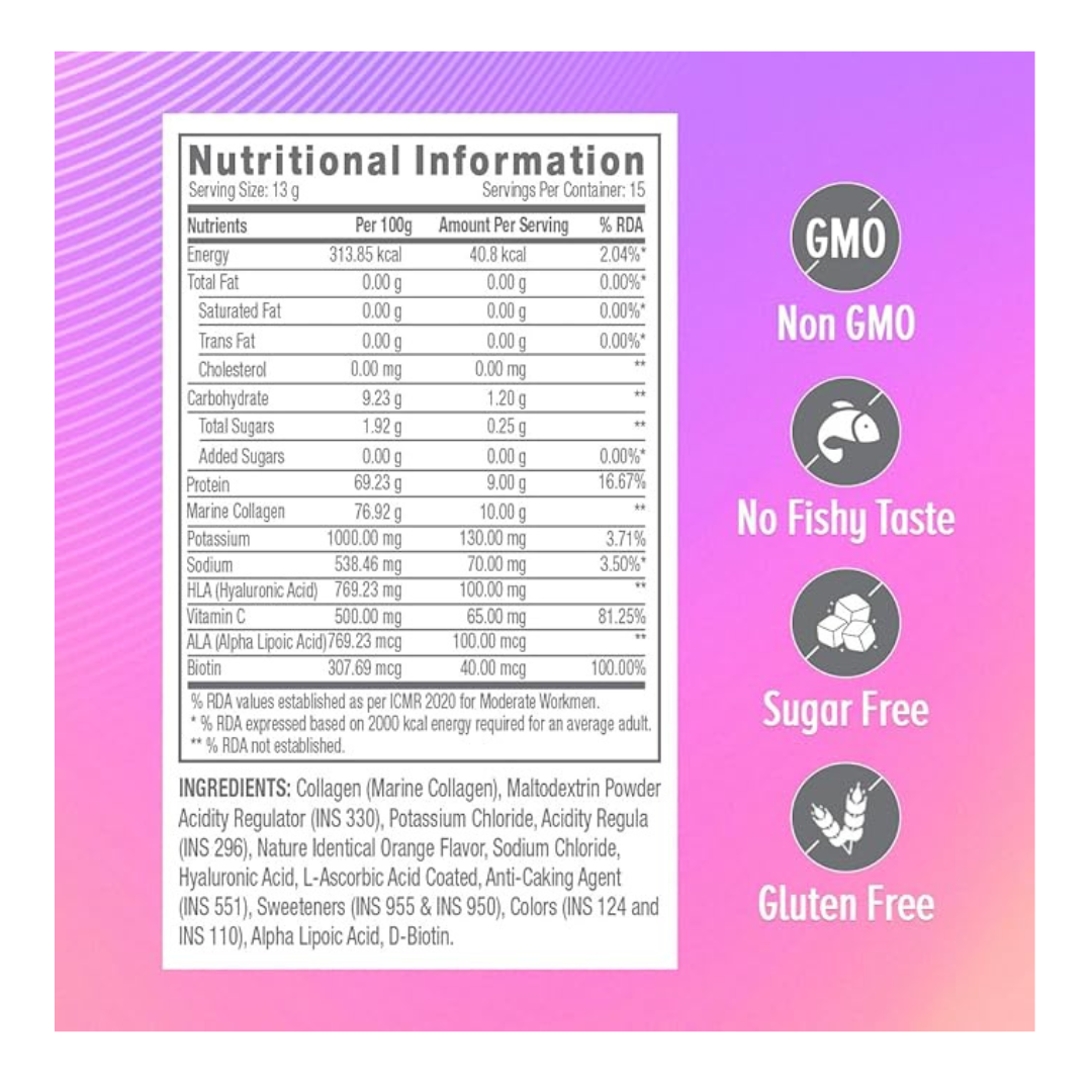KEEPS SKIN HYDRATED: The Collagen supplement is also enriched with 100mg of Hyaluronic Acid to maintain your skin's hydration barrier for keeping it soft and supple. This, in turn, minimizes wrinkles and results in a smoother skin texture.