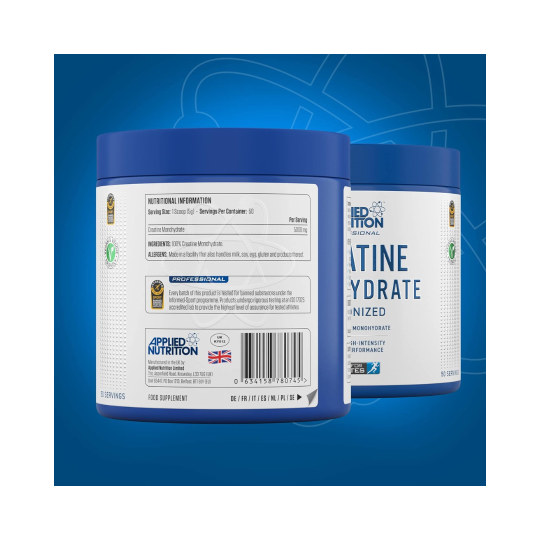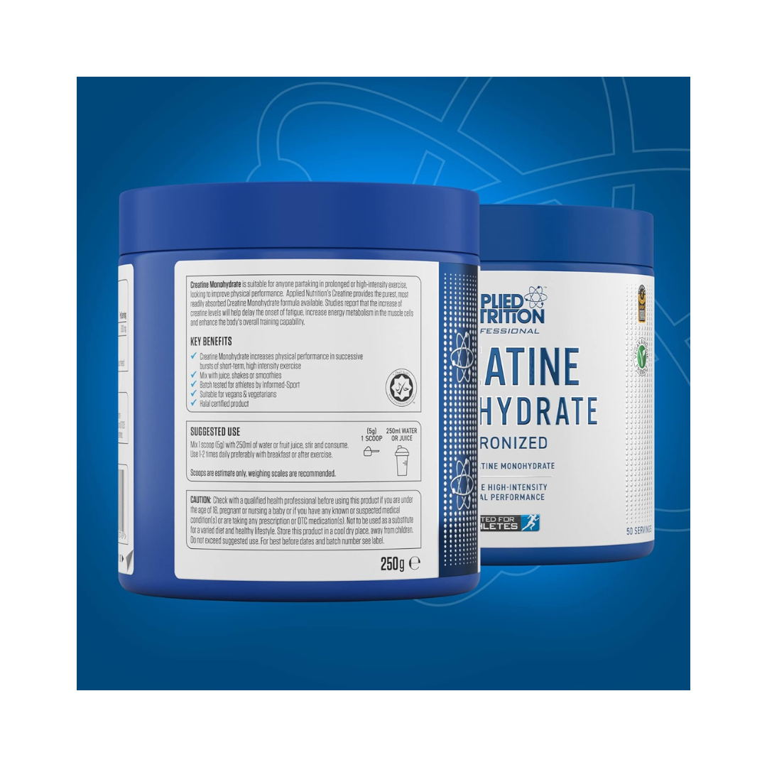 APPLIED NUTRITION Creatine Monohydrate Micronized Creatine Monohydrate is suitable for anyone partaking in prolonged or high-intensity exercise, looking to improve physical performance. Applied Nutrition's Creatine provides the purest, most readily absorbed Creatine Monohydrate formula available. Studies report that the increase of creatine levels will help delay the onset of fatigue, increase energy metabolism in the muscle cells and enhance the body's overall training capability. KEY BENEFITS . Increases Performance During High-Intensity Training. Can be easily mixed in water. Halal Certified Product.