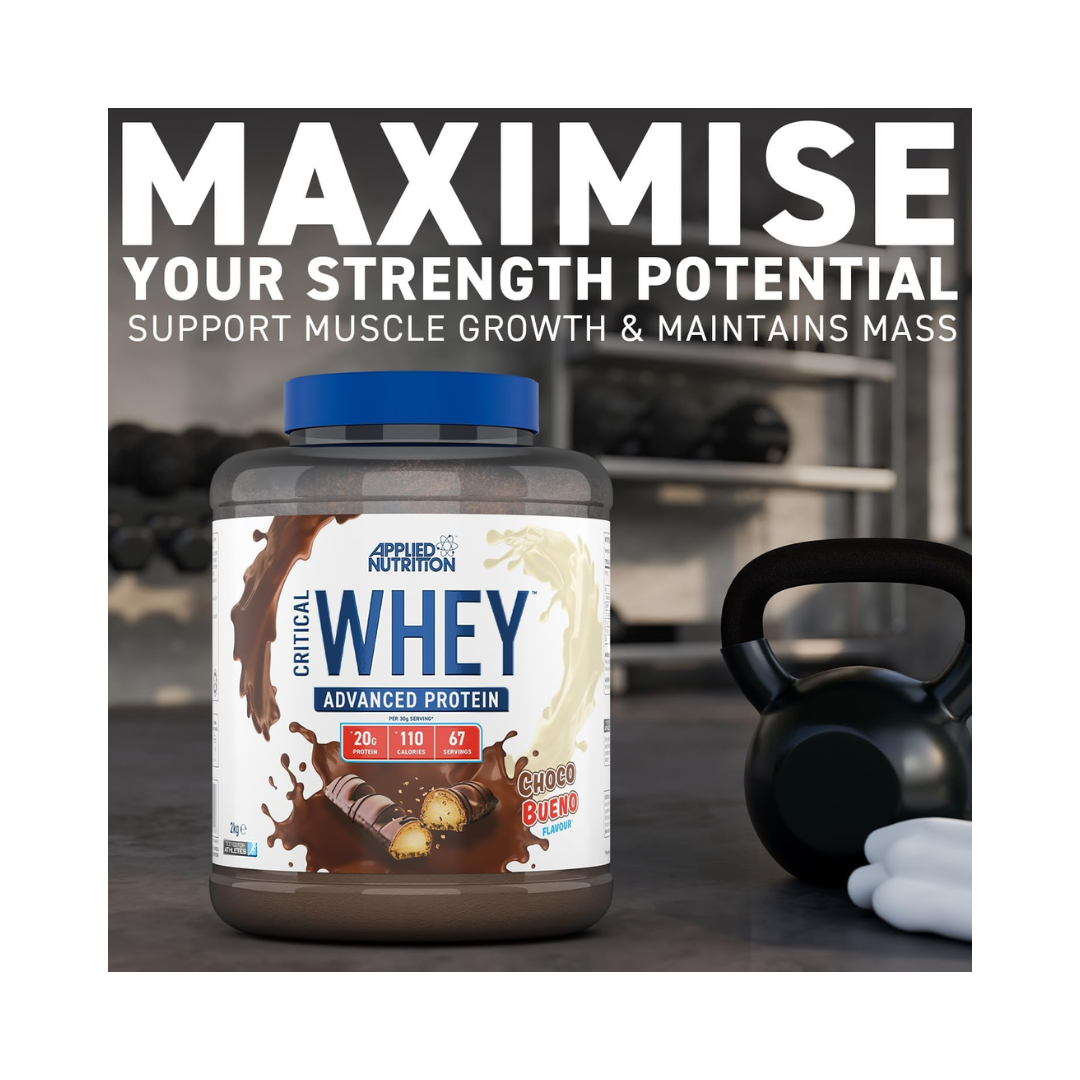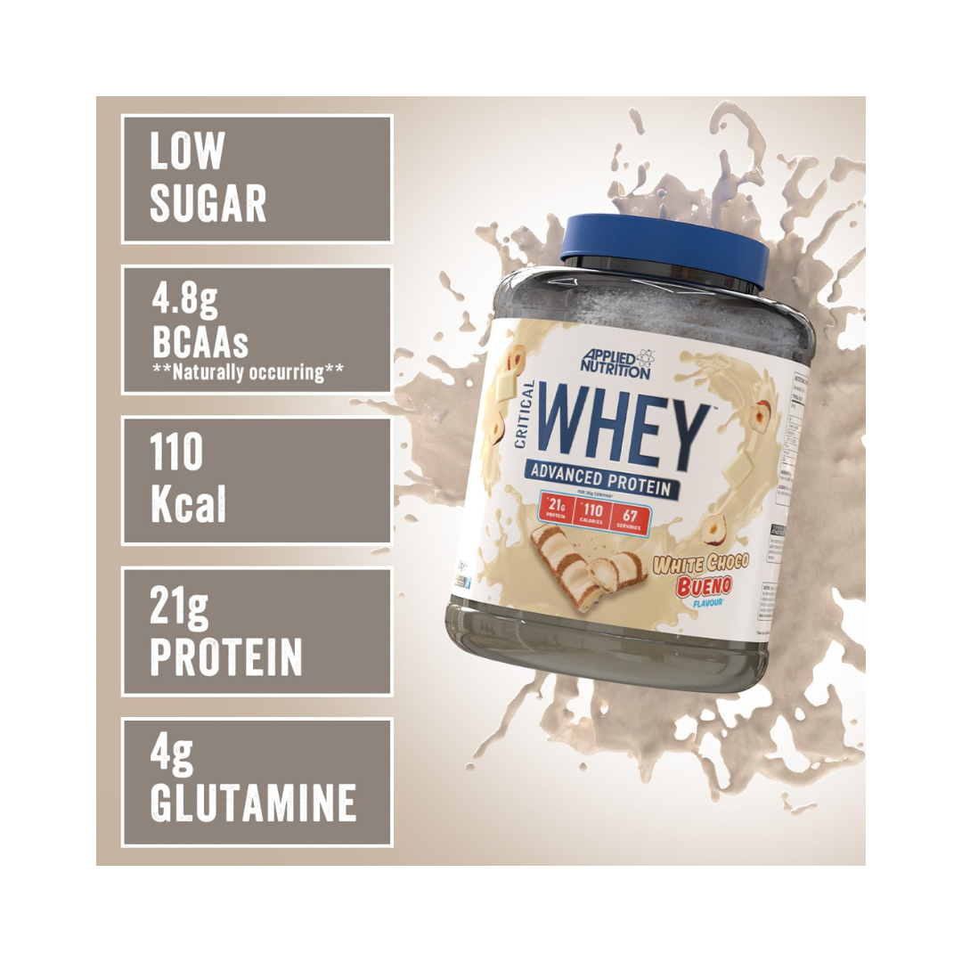 Applied Nutrition Critical Whey Protein has been developed using a unique blend of whey protein concentrate, Whey Protein Isolate & Hydrolysed Whey Protein. Whey Protein Concentrate is produced by ultra-filtration technology containing high levels of protein and branched chain amino acids (BCAAs).