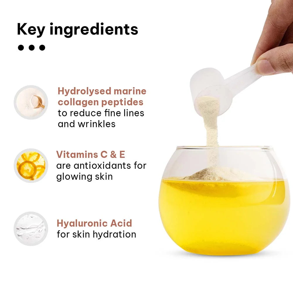 Marine collagen peptides, hyaluronic acid, vitamins C & E, and biotin