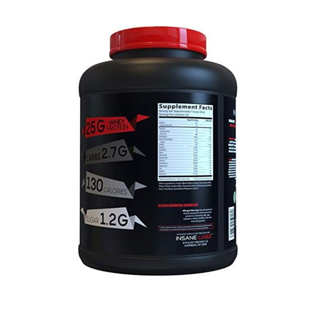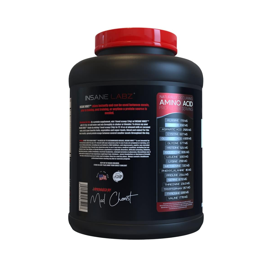 - LEAN MUSCLE GAINS. WHEY PROTEIN. GREAT FLAVORS. Insane Labz Insane Whey promotes lean muscles gains with a full dose of 25g of protein after your workout has ended. With a naturally occurring BCAA amino profile, Insane Whey will boost your recovery time as well.
