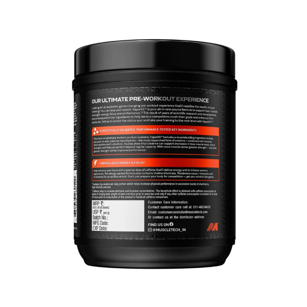 - PRE WORKOUT POWDER – MuscleTech Vapor X5 is an explosive, game-changing pre workout powder that’ll redefine the results of your training. Vapor X5 is your all-in-one-source formula for more lean muscle, strength, energy, focus and insane muscle pumps