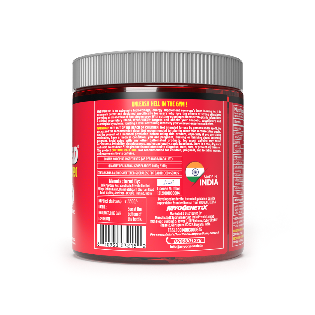 MYOSPIKED® is extremely high voltage, extreme energy supplement everyone's been looking for. MYOSPIKED® is extremely potent and designed specifically for users who love the effects of strong stimulants providing insane flow of non stop energy. With cutting edge ingredients strategically infused into a clinical proprietary blend, MYOSPIKED® targets and shocks your anabolic, vasodilatory and neurological symptoms, igniting a level of training intensity you have never experienced before. Delicious and invigorating flavor — yet packed with ample amounts of key ingredients that'll light up even the most avid stimulant fan — MYOSPIKED® ,delivers it all.*