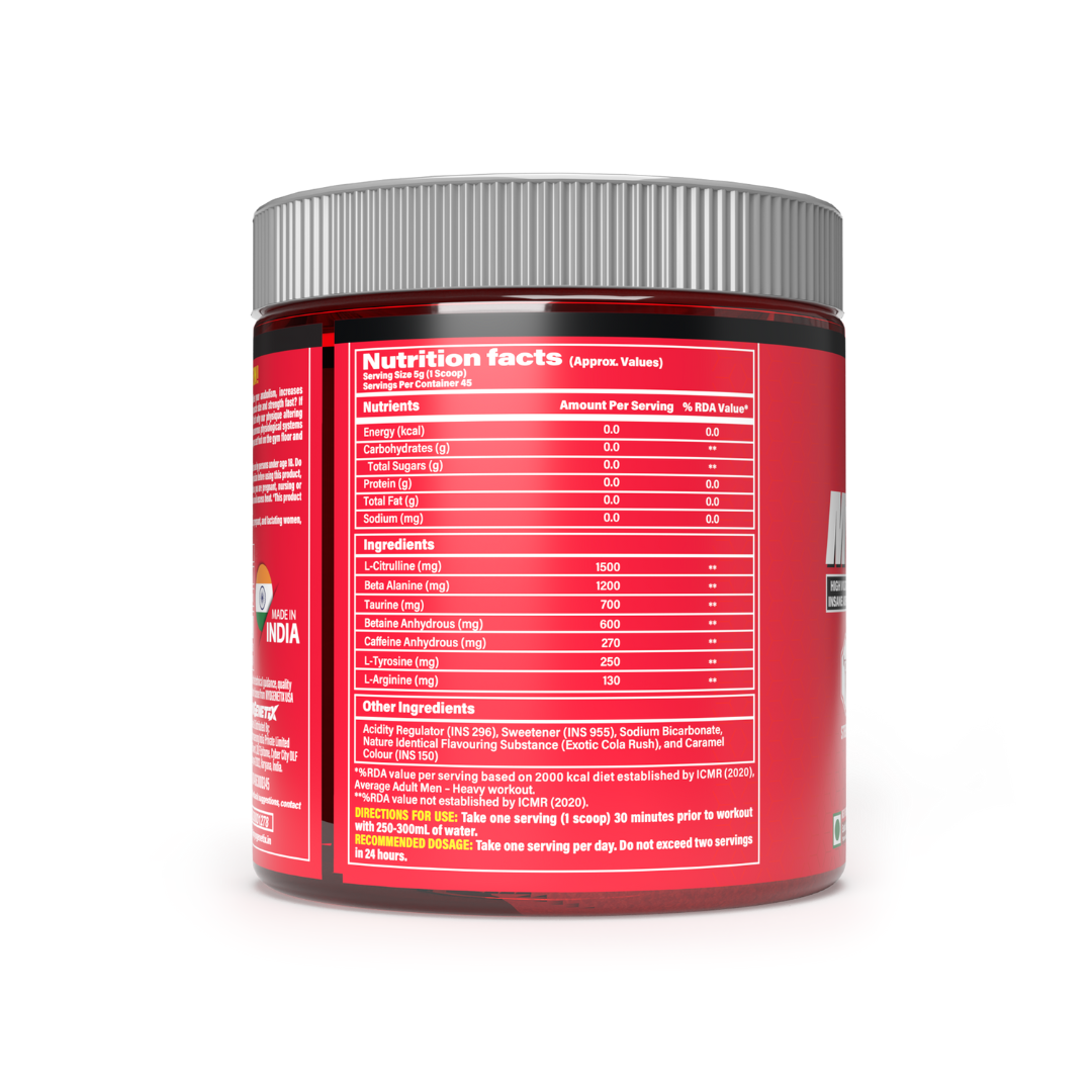 DIRECTIONS FOR USE: As a dietary supplement, take one serving (1 scoop) 30 minutes prior to workout with 8-12 oz. of water. Do not exceed two servings in 24 hours.