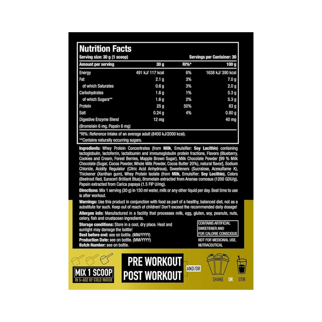Ingredients: Whey Protein Concentrates ( from Milk, Emulsifier: Soy Lecithin), Flavors (Vanilla, Raspberry, Wild Berry), Sodium Chloride, Sweeteners (Sucralose, Acesulfame K), Thickener (Xanthan Gum), Whey Protein Isolate (from Milk, Emulsifier: Soy Lecithin), Bromelain extracted from Ananas comosus (1200GDU/g), Papain extracted from Carica papaya (105 FIP U/mg), Colors (Carmoisine**, Brilliant Blue FCF).