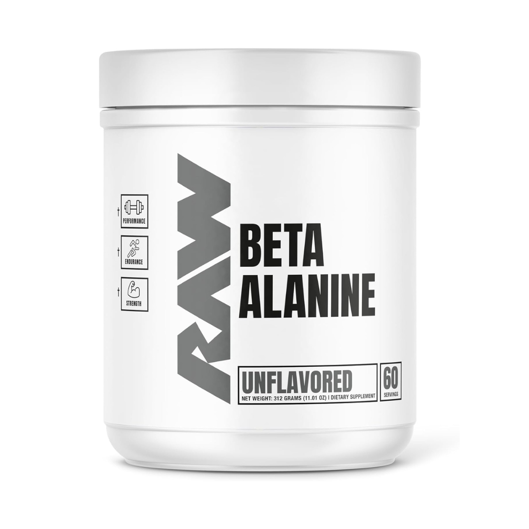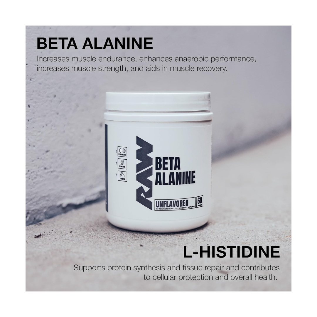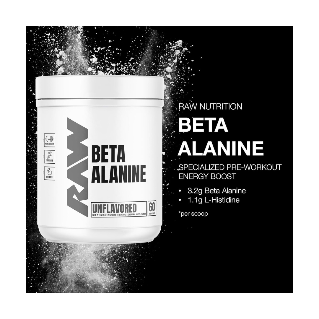 - Beta Alanine: RAW’s premium Beta Alanine formula is designed to improve muscular explosiveness and endurance. Taking RAW Beta Alanine before your workout can provide that extra boost of energy necessary to optimize your routine, improving your overall output and competitiveness. 60 servings.