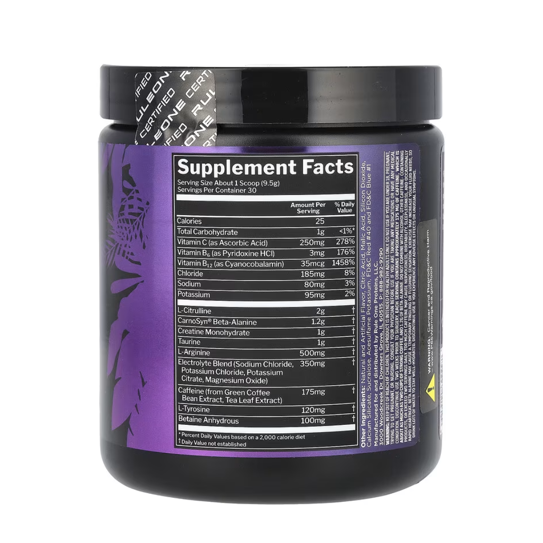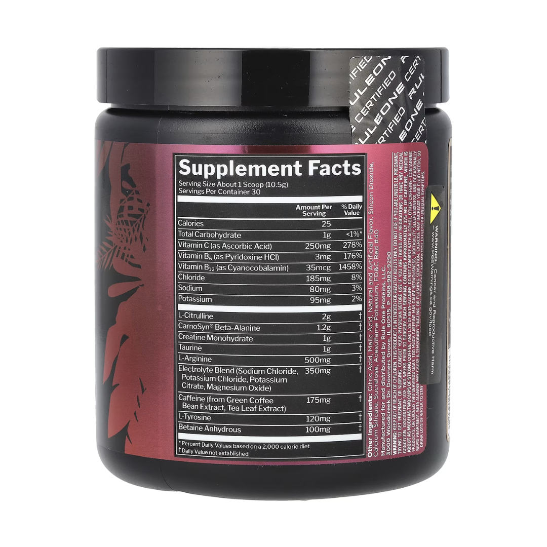 Keep out of reach of children. This product is intended for healthy adults only. Do not use if you are under 18, pregnant, trying to get pregnant, or nursing. Consult your physician before use if you are taking any medications or have any medical condition. Discontinue use two weeks prior to surgery. Each serving contains approximately 175 mg of caffeine, which is about as much as two cups of strong coffee, and 1.2 g of beta-alanine. Do not combine with alcohol, other caffeine- containing products, or exceed two servings daily. Too much caffeine may cause nervousness, irritability, sleeplessness, and occasionally rapid heartbeat. beta alanine may cause a temporary tingling or flushing sensation. Exercise may increase your fluid needs, so drink lots of water to stay well-hydrated. Discontinue use if you experience any adverse effects or unusual symptoms.
